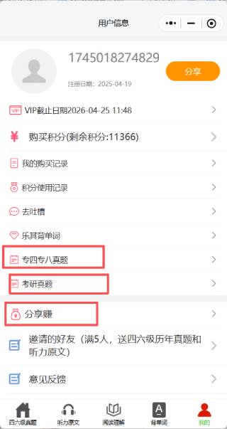 - 高考 四六级,考研,专四专八是四个不同的小程序,需要分别加入分享赚
